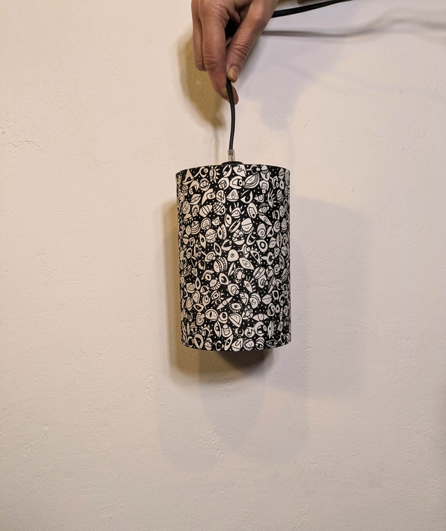 La lampe est composée de deux papiers contrecollés. Papier de soie dit papier "Mûrier" aux fibres apparentes et papier canson renforcés par un papier plastique polyphane.